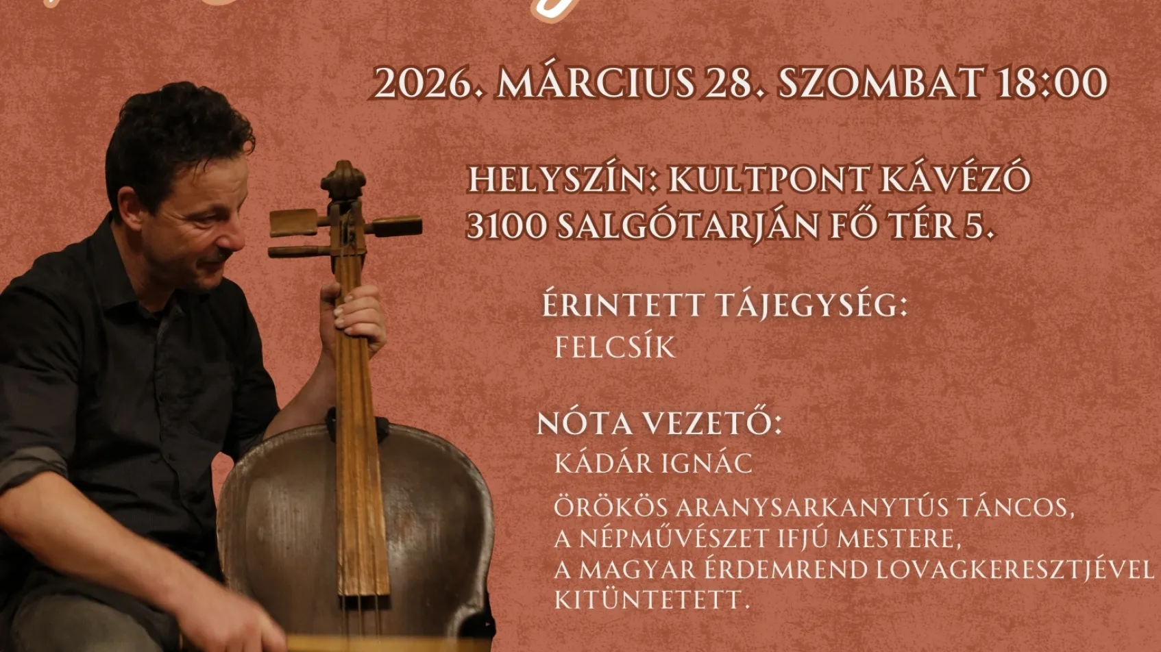 A most következő alkalommal a Felcsíki székelység népdalait nótázhatjuk a Csíkszentdomokosi gyökerű Kádár Ignác "Náci" vezetésével és a Dűvő Zenekar kíséretével, a Kávézó KultPontban.