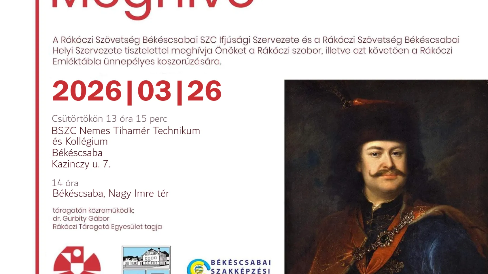 A békéscsabai Rákóczi Szövetség főszervezésében, a Békés Megyei Népművészeti Egyesület és a Békés Megyei Néptáncosok Szövetsége Közhasznú szervezet együttműködésében megvalósuló megemlékezés, melynek programja a következő: