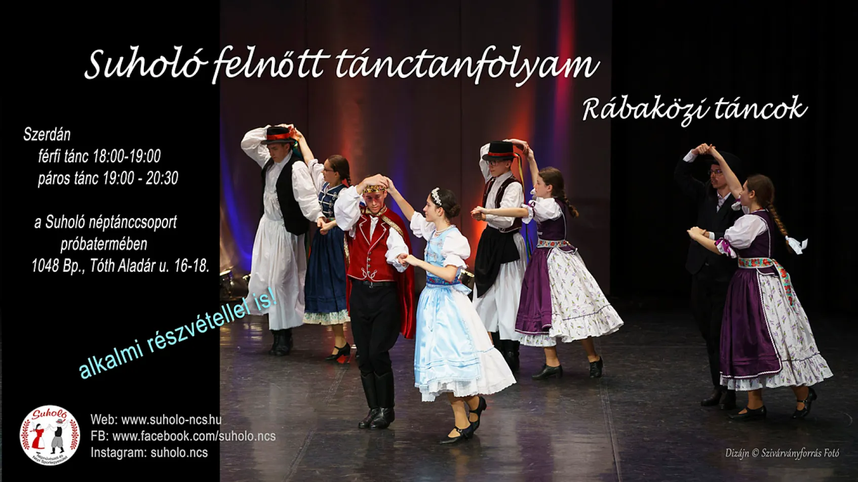 Egyszerű lépések, sokféle összekapaszkodási mód, forgás, pörgés, csalogatás, vidámság jellemzi februártól induló új táncanyagunkat, a rábaközi táncokat. Kezdőknek vagy társastáncos alapokkal rendelkezőknek is bátran ajánljuk, hamar sikerélményt ad. Az erdélyi táncokhoz szokott bennfentes táncosoknak is változatosságot hozhat ez az izgalmas, mégis könnyen tanulható kis-magyarországi tájegység.